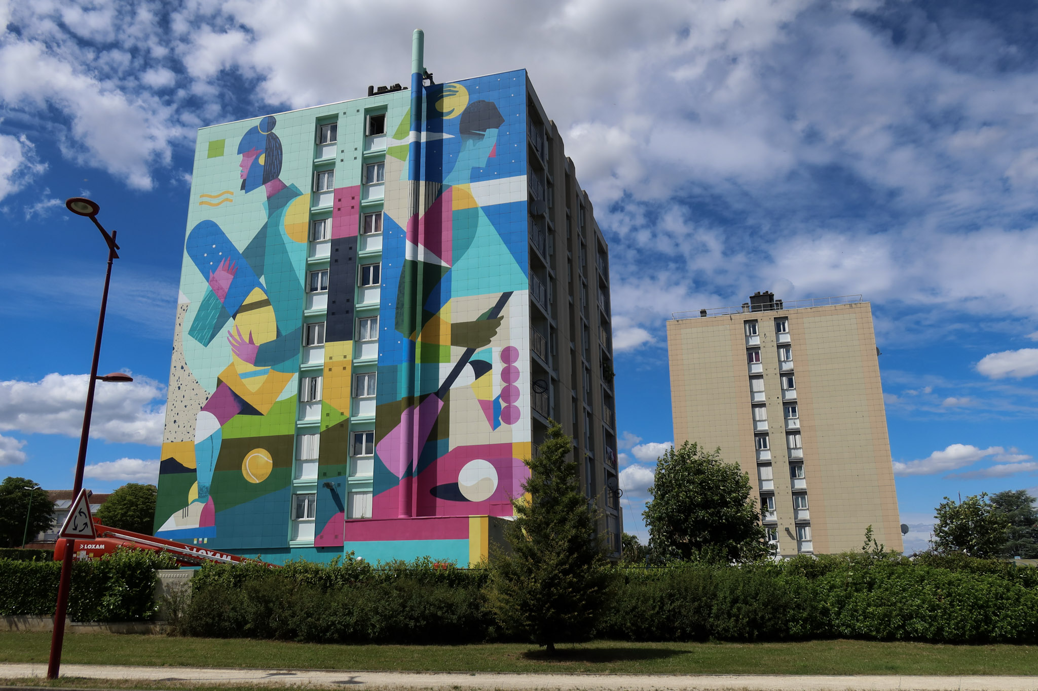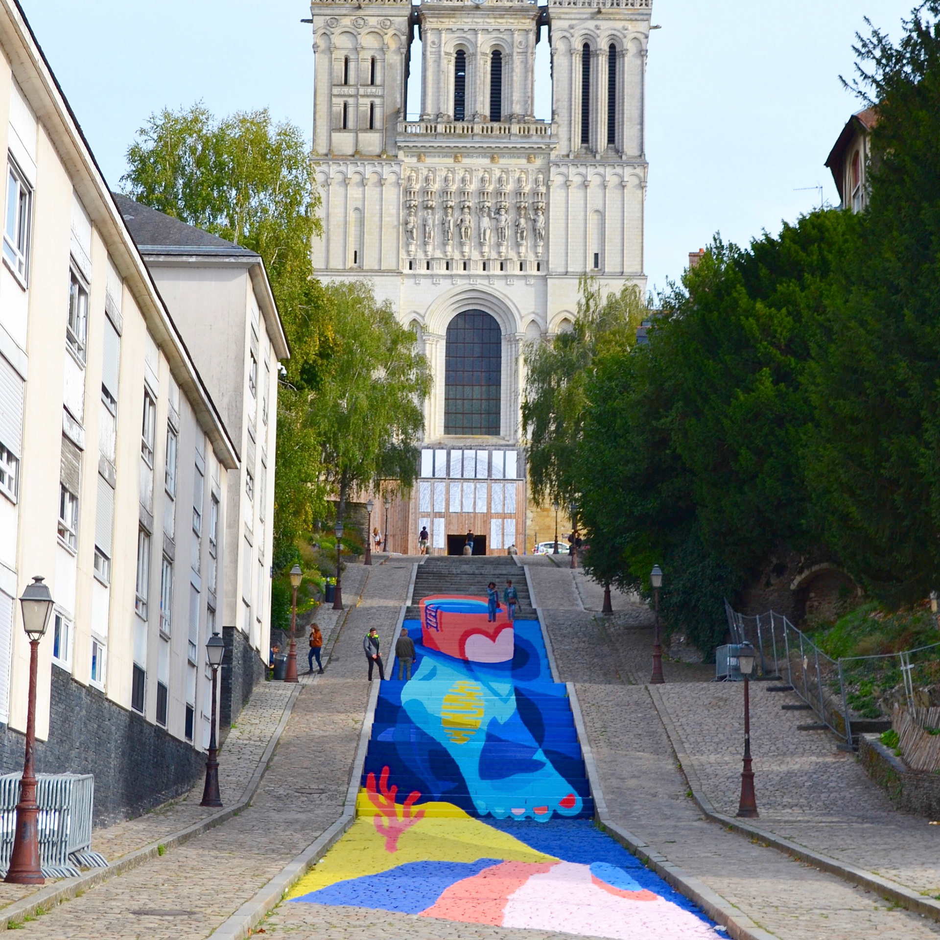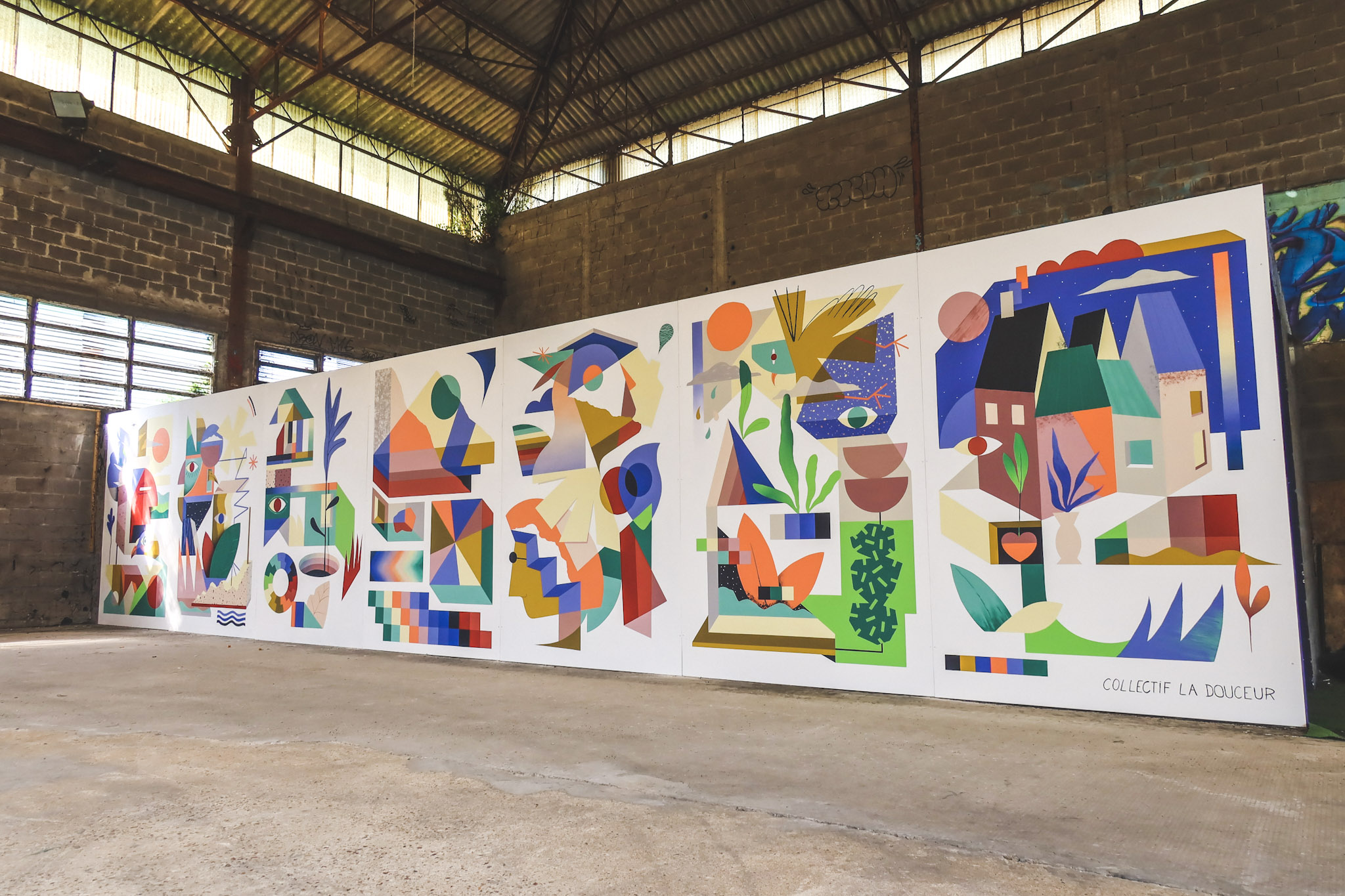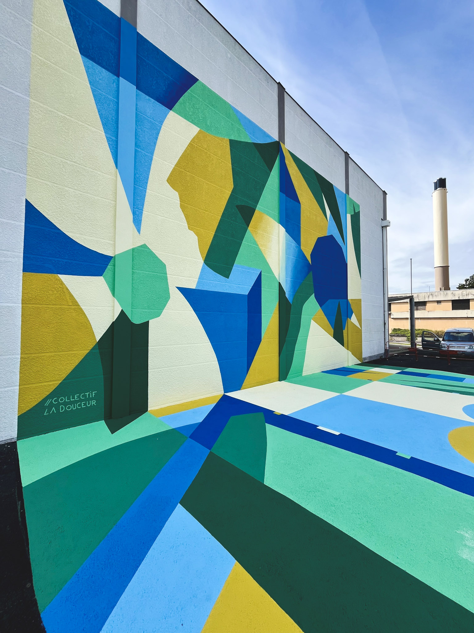 Le Collectif La Douceur est composé de deux artistes qui travaillent la peinture contemporaine. Établi à Angers mais produisant des réalisations partout en France et à l’international, le collectif transforme les surfaces en œuvres d’art. Leur travail porte sur un jeu des formes colorées qui de manière abstraites ou figuratives vont incarner le lieu sur lesquelles elles viennent habiter.
