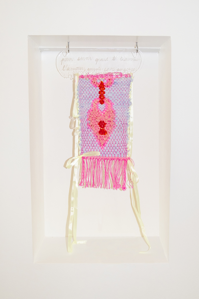 Clefs, cœurs, fleurs, et smileys sont autant d’emblèmes 2.0 fatigués que l’artiste décharge de leur puissance, pour les amener vers un registre qui n’appartient qu’à elle. Si texte et tissage partagent la même racine, les motifs qui pullulent sont-ils le rébus d’un sortilège à déchiffrer ?