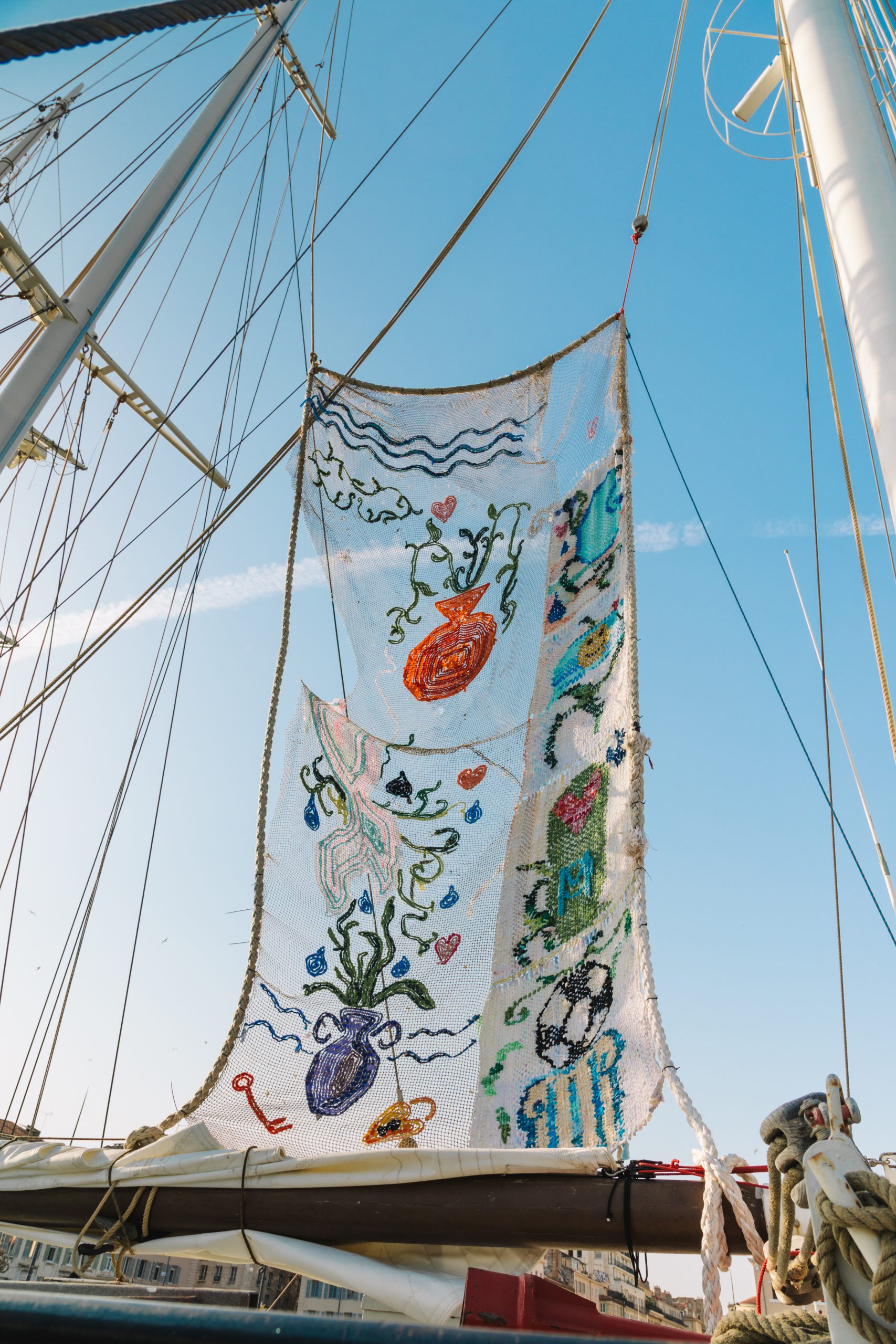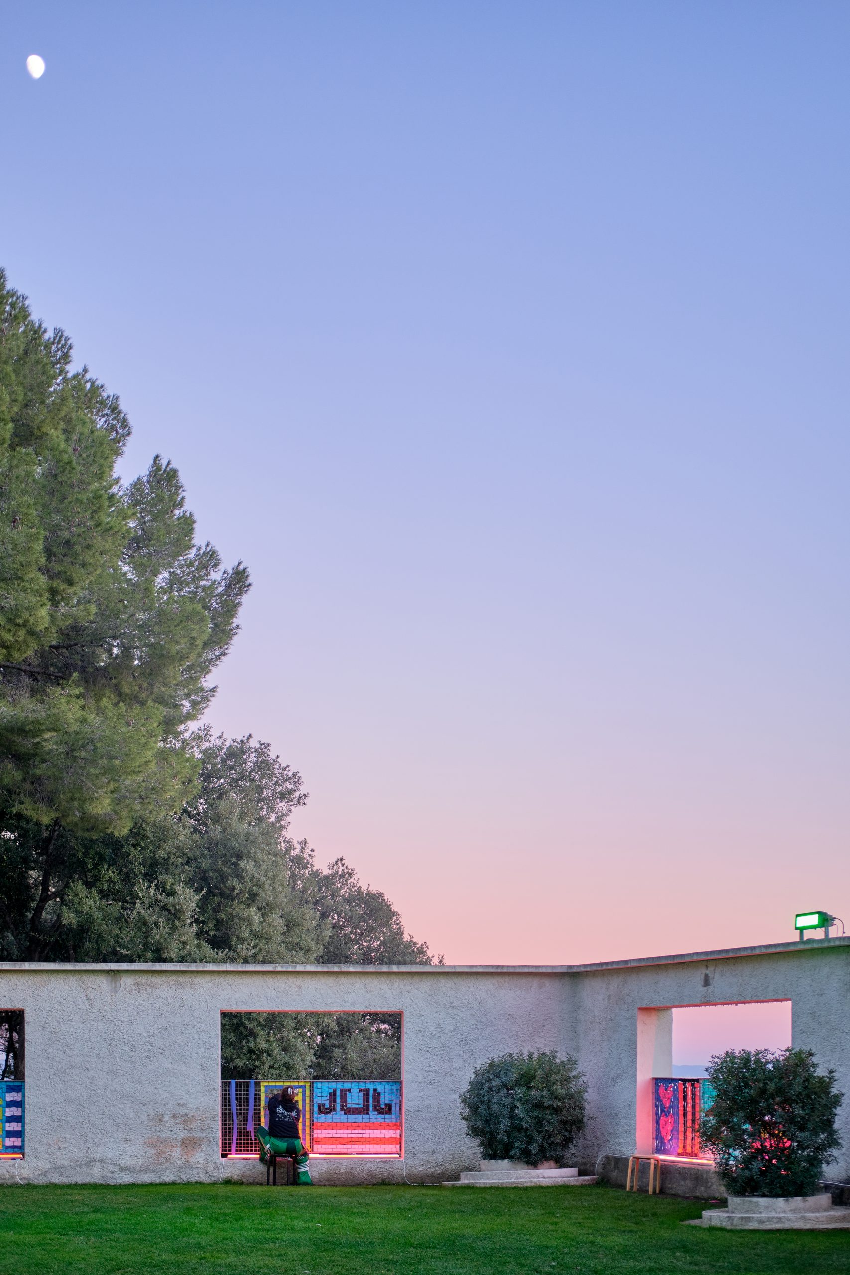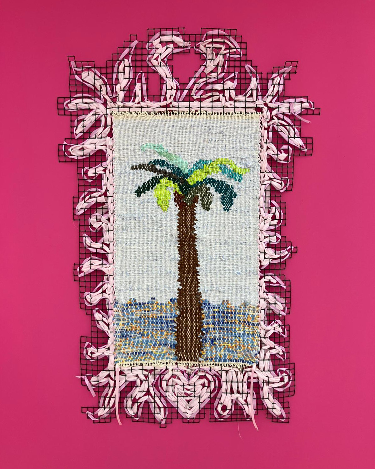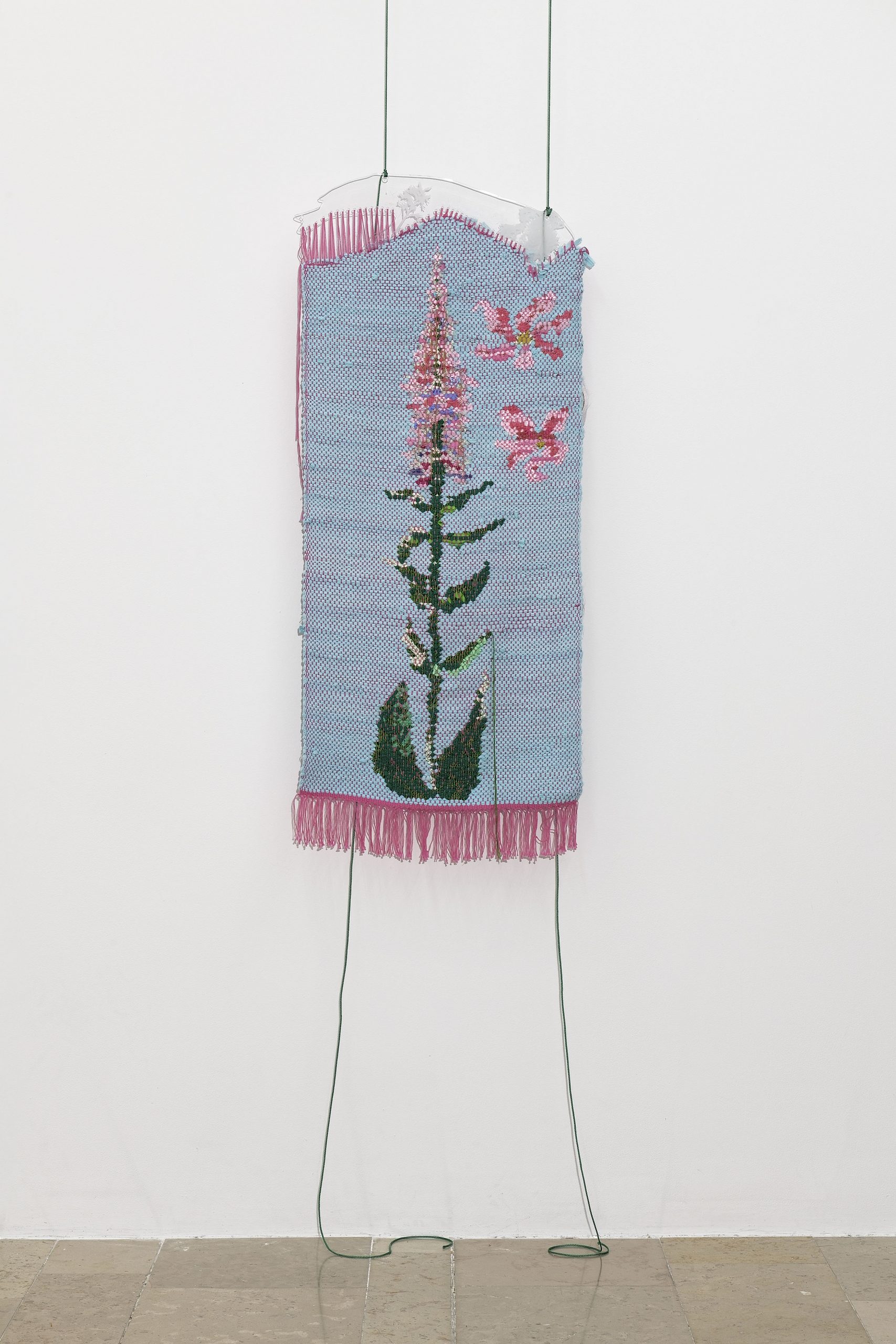 Elle fabrique des arcadies dopées à la toxicité du Delphinium et aux bienfaits de la Lavande. À ce mélange détonnant s’ajoutent les bribes de sa propre histoire, de sa jeunesse dans le Vaucluse aux aventures de Barbie©, des réseaux sociaux aux fêtes marseillaise. Pour Delphine, le tissage est un moyen de tramer, c’est-à-dire à la fois dessiner et nouer des intrigues. Ce patchwork immersif mauve et magenta, comme un dessin inachevé, se transforme en puissant outil de réconfort. Dans ces édens méditerranéens distordus par le vent et engloutis par le soleil, l’abondance semble pourtant réprimer une menace sourde. Les fleurs ne fanent plus. Les lianes rampent au sol. La symétrie absorbe l’horizon. L’allégresse n’est-elle plus qu’un mirage abstrait ?