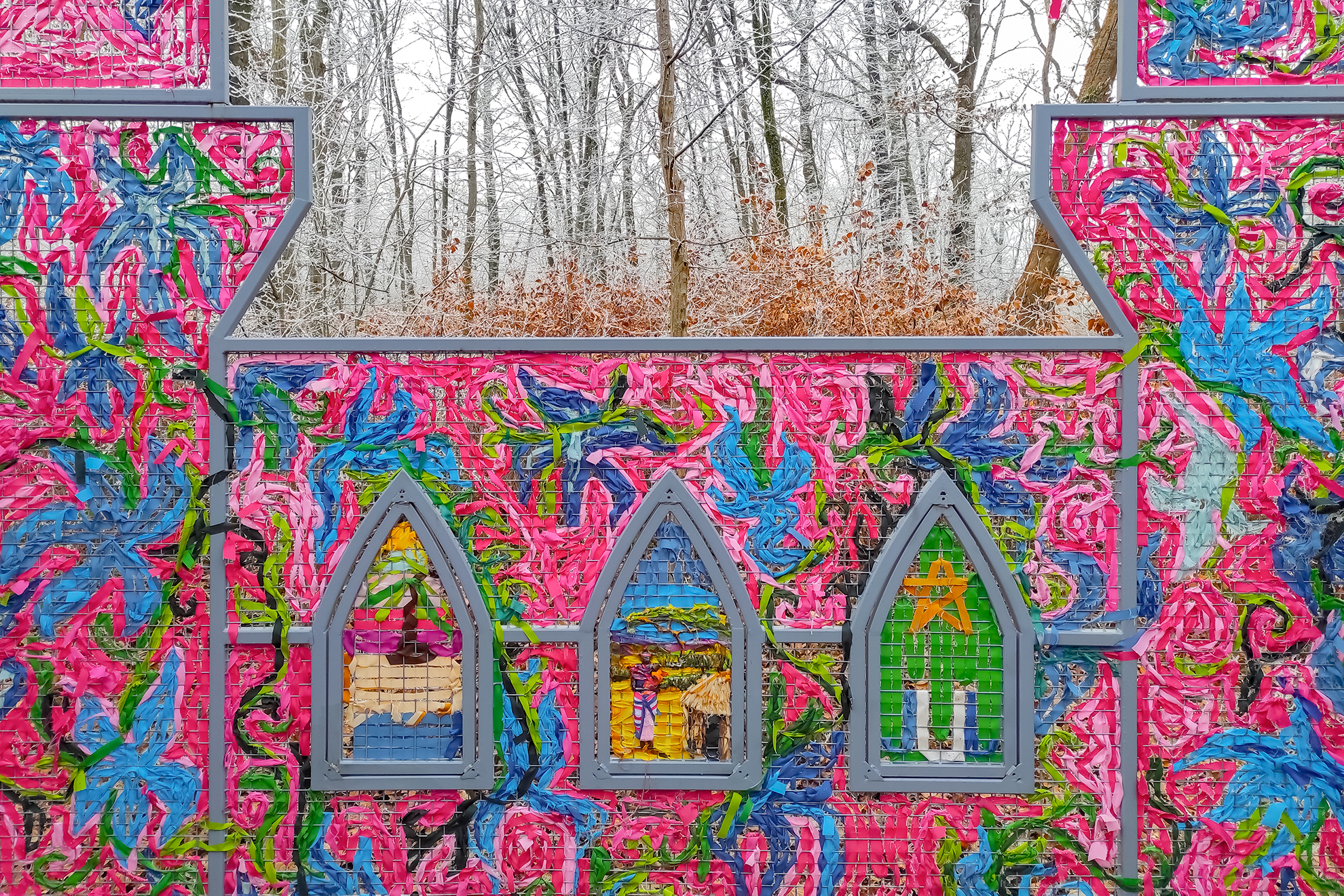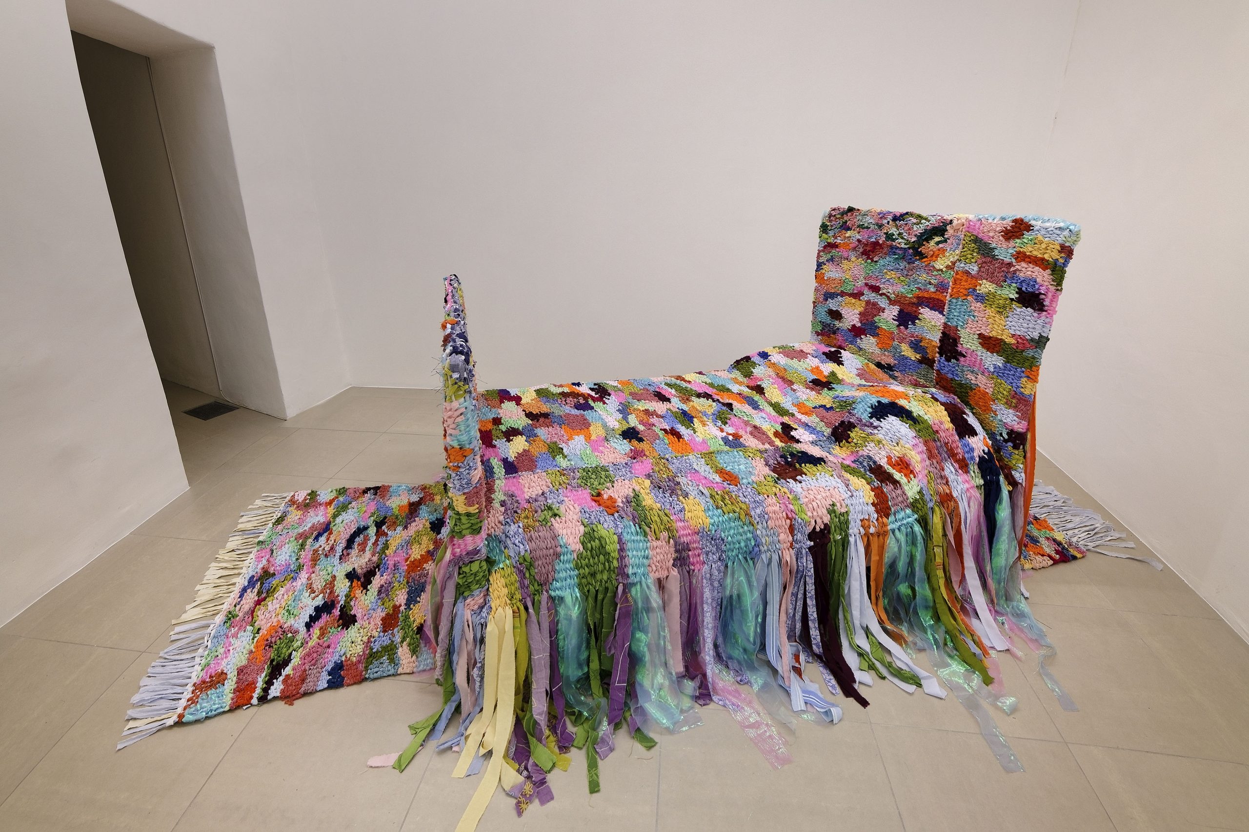 Son geste obsessionnel se répète dessus, dessous, encore. Le tapis de lirette, jadis étoffe paysanne, désormais château, cabane ou chapelle, n’est plus cantonné au mur mais devient la structure-même de ces refuges. Pour les édifier des lieux à soi, elle entrelace des lambeaux usés, déjà imprégnés de souvenirs tactiles anonymes. Ici, plus de porte ni de toit car le tissu, à l’inverse du lierre, protège sans étouffer.
