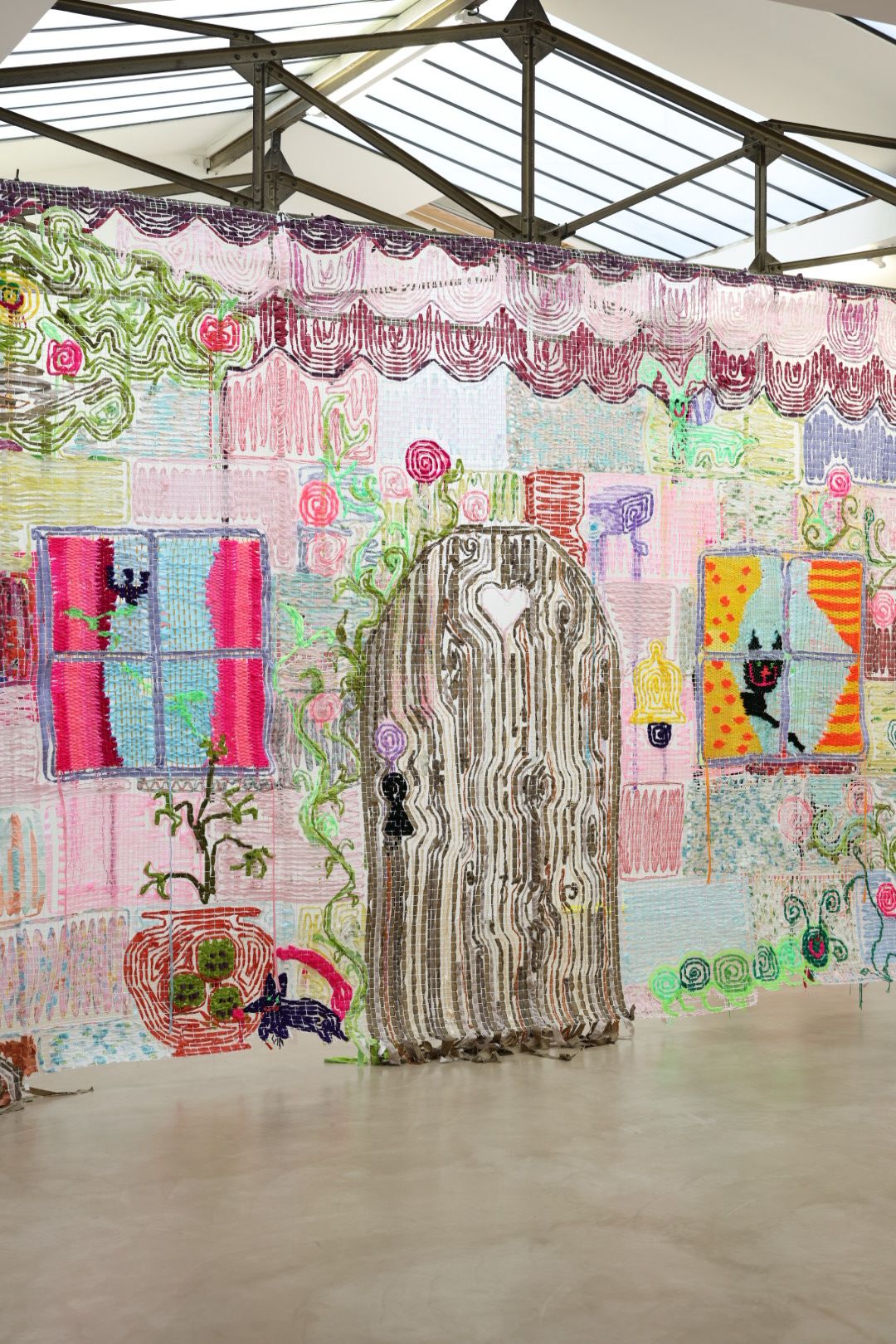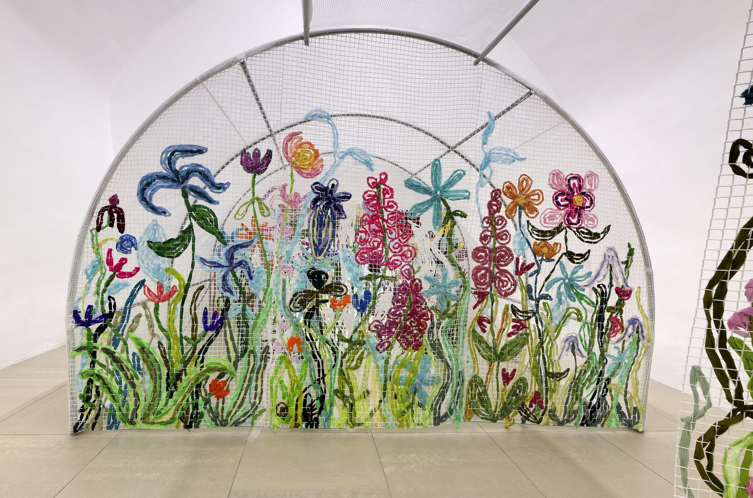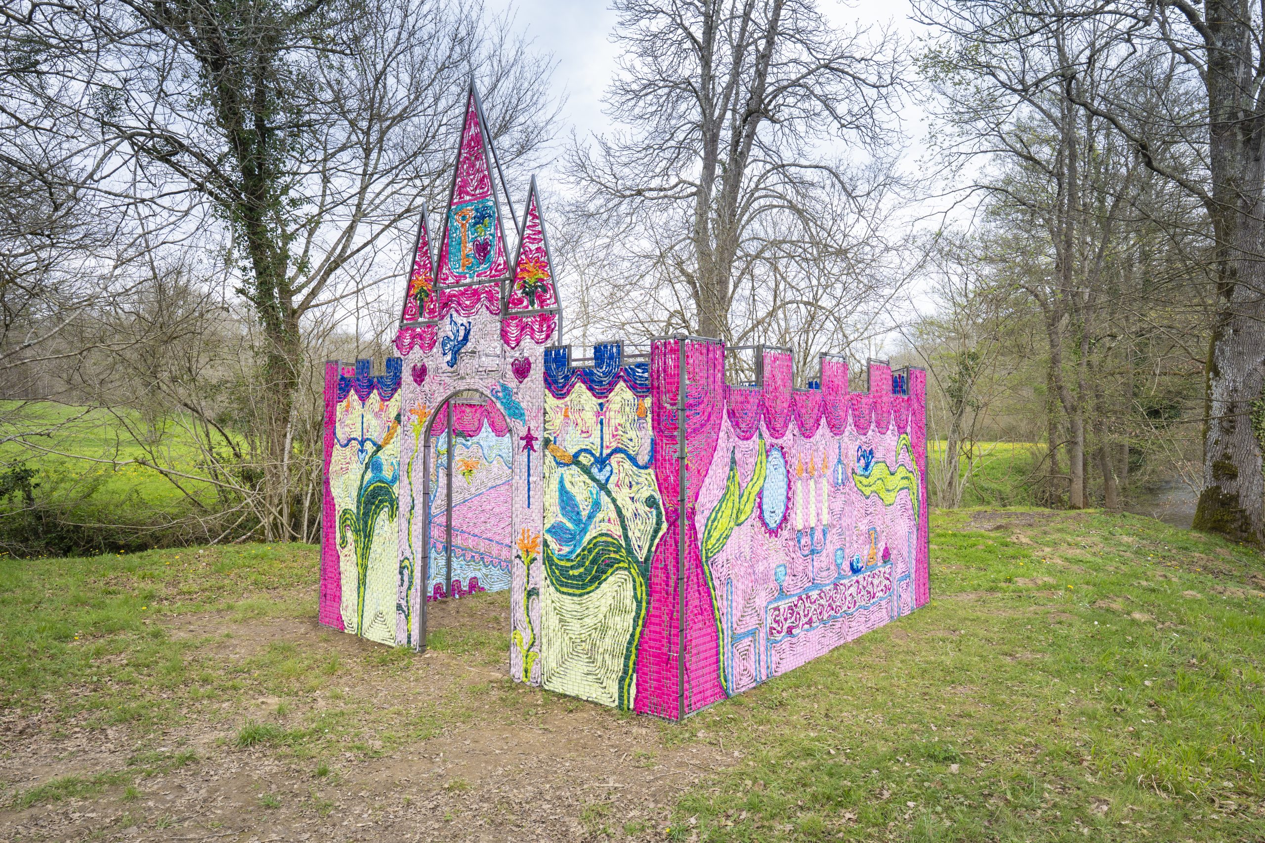 Delphine Dénéréaz tisse tout, sur tout, partout. Ses œuvres efflorescentes se déploient à la manière des plantes invasives. Les fils roses serpentent entre les trames de tissus ou de métal, ensevelissent les maisons, troublent les jardins.